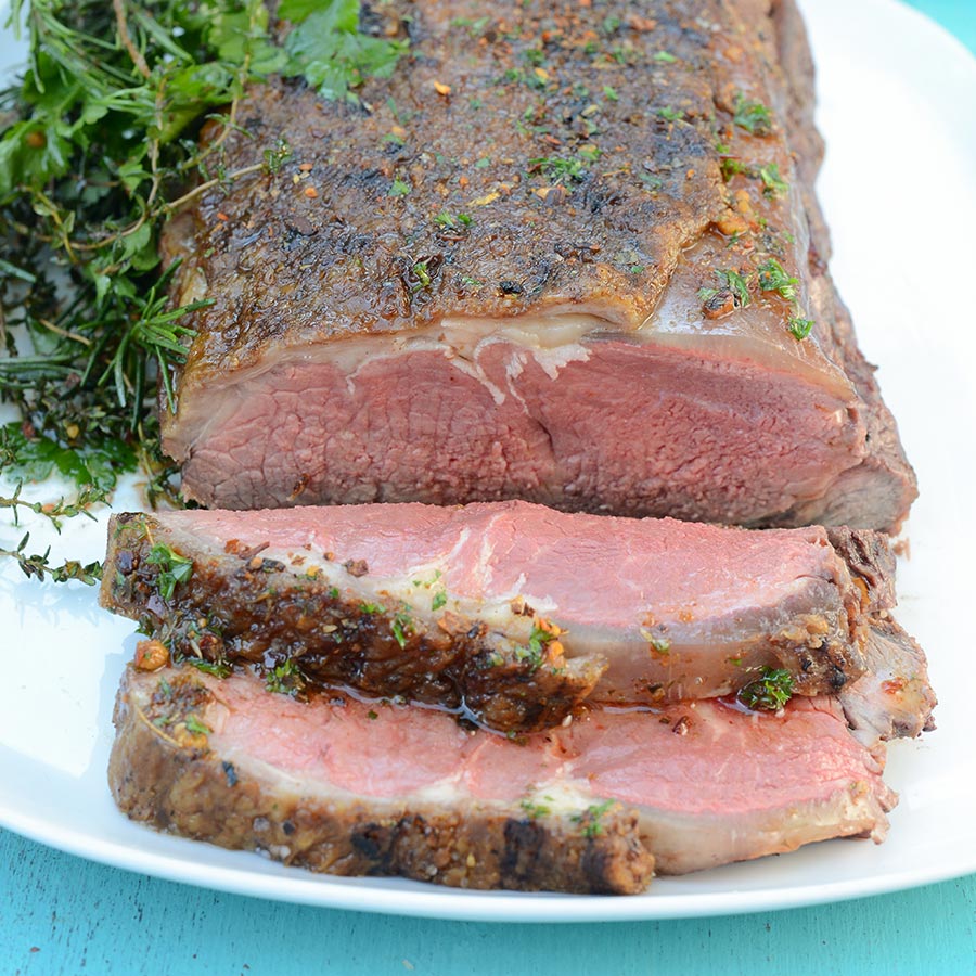 Grilled Grass Fed Boneless Ribeye Roast With Chimichurri Recipe Ingredients For the Meat 1 boneless Rib-Eye, about 4 lbs. Kosher salt, 1 cup For the Chimichurri 2/3 cups hot water ½ tbsp. kosher salt 1 garlic clove, finely chopped 2 tbsp. fresh oregano, chopped 1 tsp. red pepper flakes 3 tbsp. chopped parsley 2 tbsp. red wine vinegar 1/3 cups olive oil For the Herb Brush 4 sprigs Fresh parsley 4 sprigs Fresh rosemary 4 sprigs Fresh thyme Directions Mix all the chimichurri ingredients in a saucepan over low heat and mix to combine. Leave to cool and keep in the fridge, covered. Trim excess fat or silverskin from the meat. Rub the kosher salt over the meat, on both sides. Tie the sprigs of fresh herbs together with string, making a “brush”. Turn your grill on to high heat or if using coals, use a two-zone system, with the high heat on one side and less coals (less heat) on the other side. Sear the meat on both sides, about 2-3 minutes each side, then place the ribeye on the grill, fat side down, over the hottest part of the grill. Grill for 25 minutes, then move to the lower heat side and continue grilling for another 20 minutes. Use the herb brush to brush the chimichurri over the meat and go on grilling over low heat for another 20 minutes. Flip the meat, brush with the chimichurri sauce again, and continue to grill until medium-rare or well done, another 20 minutes or so. Transfer to a cutting board, and cover. Let it rest for about 5 minutes then slice against the grain. This recipe is found in:
