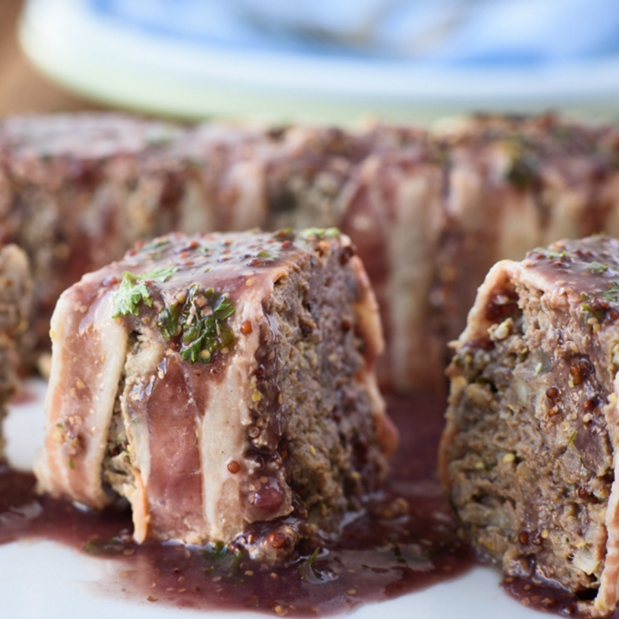 Mini Venison Meatloaf Recipe Ingredients For the meat: 12 thin bacon slices 1lb, minced or ground venison 1 small chopped onion ¼ lb, sausage or chorizo meat squeezed from the skins 1 tablespoon, fresh chopped parsley ¼ cup, fresh breadcrumbs or panko 1 tablespoon, wholegrain mustard 1 teaspoon, Worcestershire sauce 1 egg For the sauce: 1 cup, Merlot red wine 2 tablespoons, whole grain mustard ½ tablespoon, honey or sugar 2 teaspoons, cornstarch 1 tablespoon, water 2 tablespoons, chopped parsley 1 tablespoon, olive oil Directions For the Meat: Preheat your oven to 375 F. Line two small loaf pans with the bacon slices, leaving an overlap at the sides. Put to one side. In a bowl, combine the ground venison with the rest of the ingredients (except the sauce ingredients). Mix them together (by hand is the most effective way). Pack the mix firmly into the pans and wrap with the bacon slices, covering each meatloaf completely. Put the pans on a baking tray or sheet and bake in the middle of the oven for 45-50 minutes until meatloaves are firm and cooked all the way through. Let rest for 10 minutes, cover in sauce and serve. For the Sauce: in a small pan, mix the wine, mustard and honey on low heat, then bring to a low simmer for 3 minutes. Add the cornstarch and simmer until the sauce thickens. Toss in the parsley. This recipe is found in: