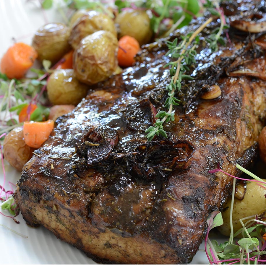 Pork Loin In Balsamic and Red Wine Recipe Pork Ingredients 1 large red onion ½ cup of 10 year aged balsamic vinegar 2 cups of sweet red wine (such as Merlot) 2 tablespoons of Italian spices 2 bay leaves 2 lbs Pork Loin Salt and pepper Directions Mix the spices with onion, balsamic and red wine to make a marinade and marinade the loin for 2 hours (minimum). Heat oven to 375F. In a roasting pan roast the loin and marinade for 30-45 minutes or until internal temp reaches 145F. Baste with juices every 15 minutes until done. Rest for 10 minutes. Slice and serve Potatoes Ingredients 2 whole carrots 1 bag of mixed small potatoes 2 tablespoons of olive oil 1 tablespoon of Italian spices Salt and pepper Directions Heat oven to 375 F. Slice carrots to ½-inch pieces. Place potatoes and carrots in roasting dish, toss with olive oil spices and season with salt and pepper. Add the olive oil, Italian spices and salt and pepper on top. Cook for 30 minutes and serve. This recipe is found in:
