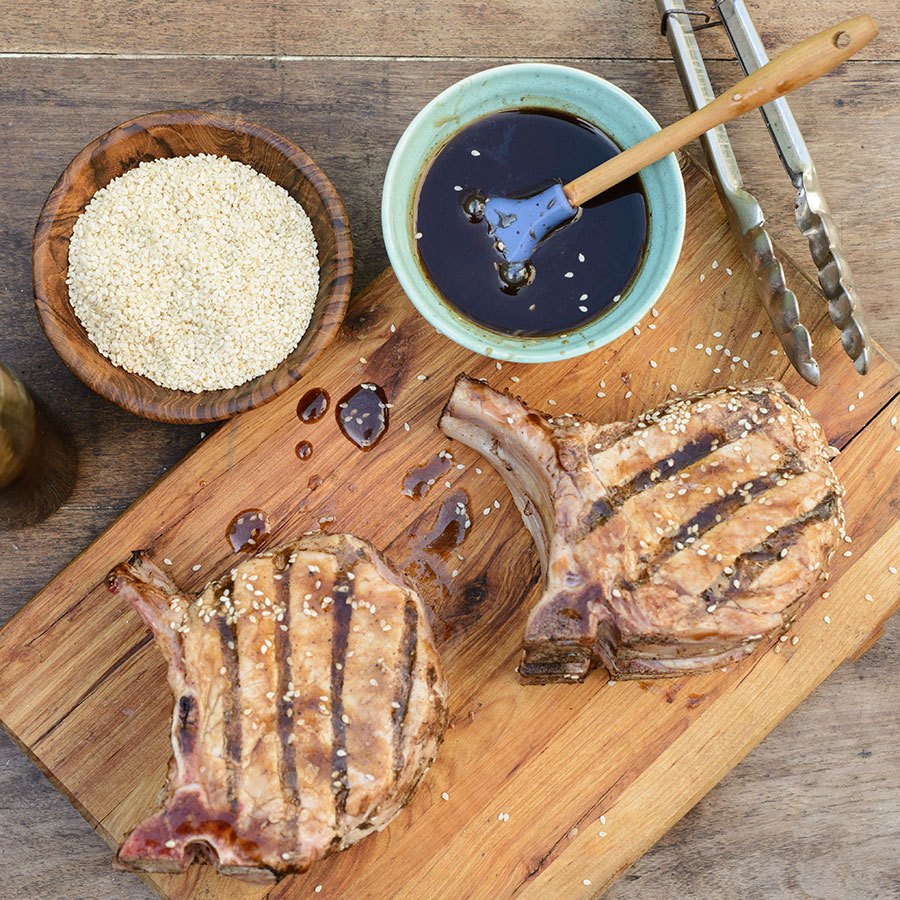 Teriyaki Grilled Pork Chops Recipe Ingredients For the Pork Chops 4 double-cut pork chops, 1 ½ inch thick 1 tbsp. olive oil 6 tbsp. teriyaki sauce 2 tbsp. sesame seeds For the Slaw 4 cups white cabbage, finely sliced 3 granny smith apples, peel on and julienned 1 tbsp. of lemon juice 2 tbsp. of olive oil 2 tbsp. sherry vinegar 1 cup fresh basil 1 cup fresh parsley Directions Using a sharp knife trim any excess fat from the chops. Brush with olive oil, and season with salt and pepper. Get your grill to medium heat. Place the pork chops and grill for 8 minutes. Flip over, brush with sauce and grill for 2 minutes. Flip and brush twice more. Finish grilling and sprinkle with sesame seeds. Toss the cabbage, apples, lemon juice, olive oil, salt, pepper and vinegar and add the parsley and basil right before serving. This recipe is found in: