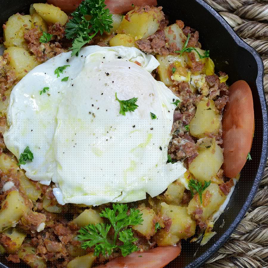 Wagyu Corned Beef Hash Recipe Ingredients 8 oz.Wagyu Corned Beef 4 eggs 1 large tomato, sliced 4 large potatoes, peel and diced ½ large sweet onion, diced ½ green pepper 1 bunch parsley, chopped finely 1 tsp. paprika 3 tbsp. butter 3 tbsp. olive oil 1/3 cup tomato sauce Salt and pepper, to taste Directions Boil the potatoes until soft, drain and reserve. Bring the olive oil and butter on a large pan to medium heat and add the onions. Saute until the onions are slightly tender. Add the potatoes, corned beef, tomato sauce, salt, pepper and paprika and saute on medium-high for about 7 minutes. Toss in green pepper and parsley, stir and cook, covered, for another 2 minutes. Reserve warm. In a separate frying pan, fry 4 eggs. Plate the hash on a plate and top with a fried egg and slices of tomatoes, garnishing with a sprinkle of fresh parsley. This recipe is found in: